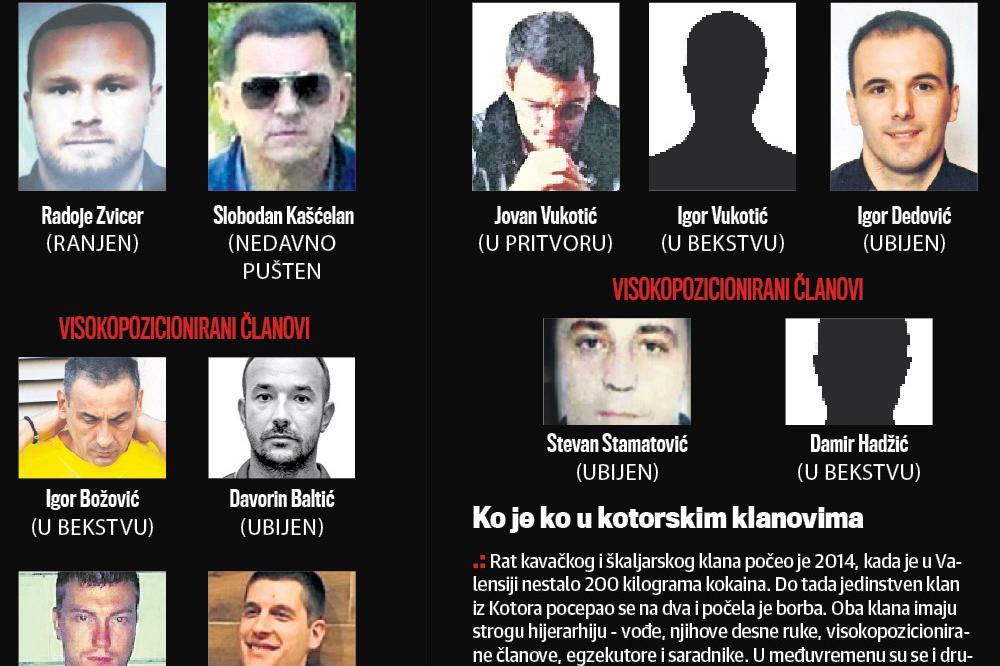 – Kašćelan je u pritvoru u Spužu od aprila, dok je Zvicer u bekstvu i za njim je raspisana poternica. Njih dvojica se terete za stvaranje kriminalne organizacije, ali i za ubistvo, otmicu i druga teška krivična dela – podseća naš sagovornik. Jovan Vukotić navodno predvodi najmanje 105 osoba, dok Zvicer i Kašćelan u svojim redovima imaju najmanje 140 identifikovanih “vojnika”, koji su bili spremni da u svakom trenutku obavljaju najprljavije poslove.