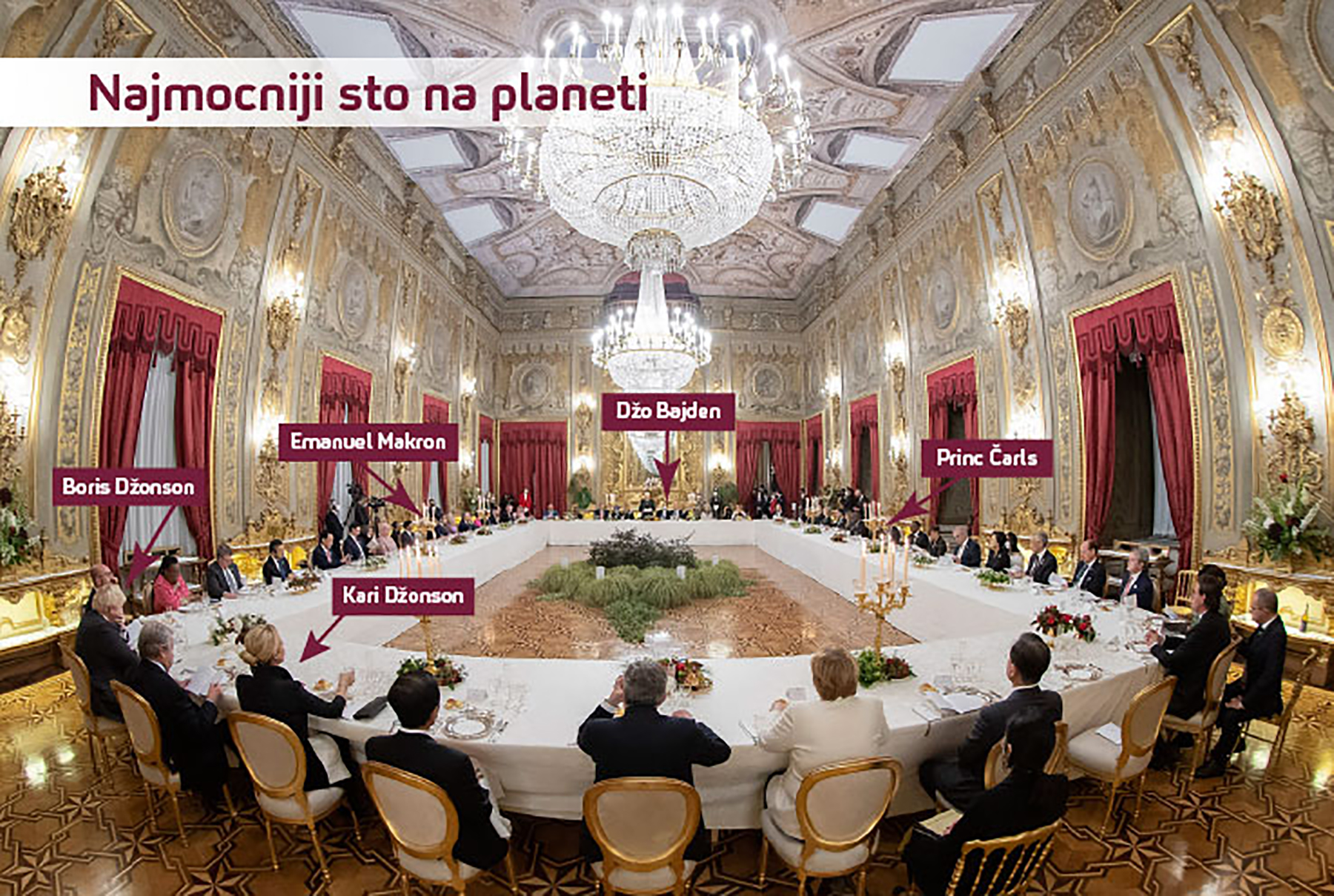 Pa su tako britanski princ Čarls, francuski predsednik Emanuel Makron, predsenik Sjedninjenih Država Džozef Bajden i britanski premijer Boris Džonson sedeli na različitim “polovima” stola.