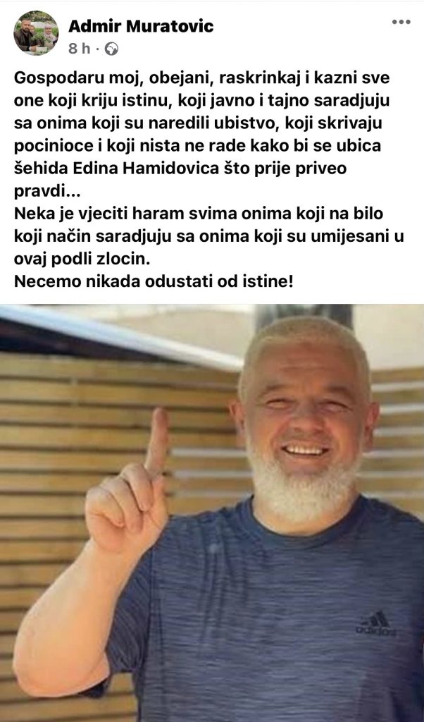 On je putem svog Facebook naloga zamolio Boga da obejani raskrinka i kazni sve one koji javno i tajno sarađuju sa onima koji su naredili ubistvo rahmetli Edina Hamidovića!