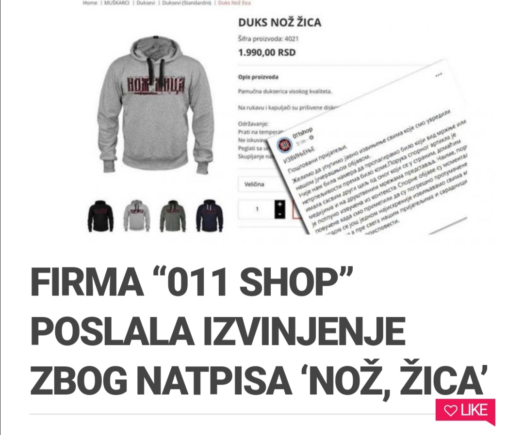 Nakon što se u prodaji putem online platforme pojavila dukserica sa natpisom „Nož, žica“ vijest je odjeknula regionom ali i svijetom. Svojim novim artiklom izazvali su zgražanje i osude na društvenim mrežama, od strane prijatelja i poslovnih partnera.