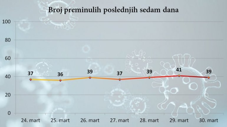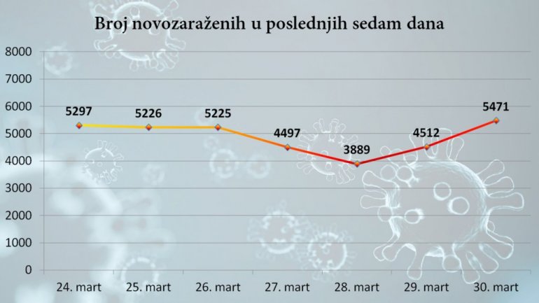 U Republici Srbiji do 15 časova 30. marta 2021. godine registrovano je ukupno 595.489 slučajeva kovid 19. Od poslednjeg izveštaja testirani su uzorci 18.528 osoba od kojih je 5.471 pozitivna. U poslednja 24 sata preminulo je 39 osoba