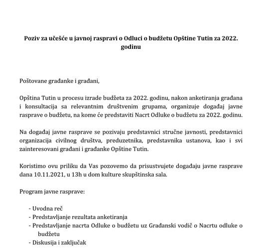 Poziv za učešće u javnoj raspravi o Odluci o budžetu Opštine Tutin za 2022. godinu
