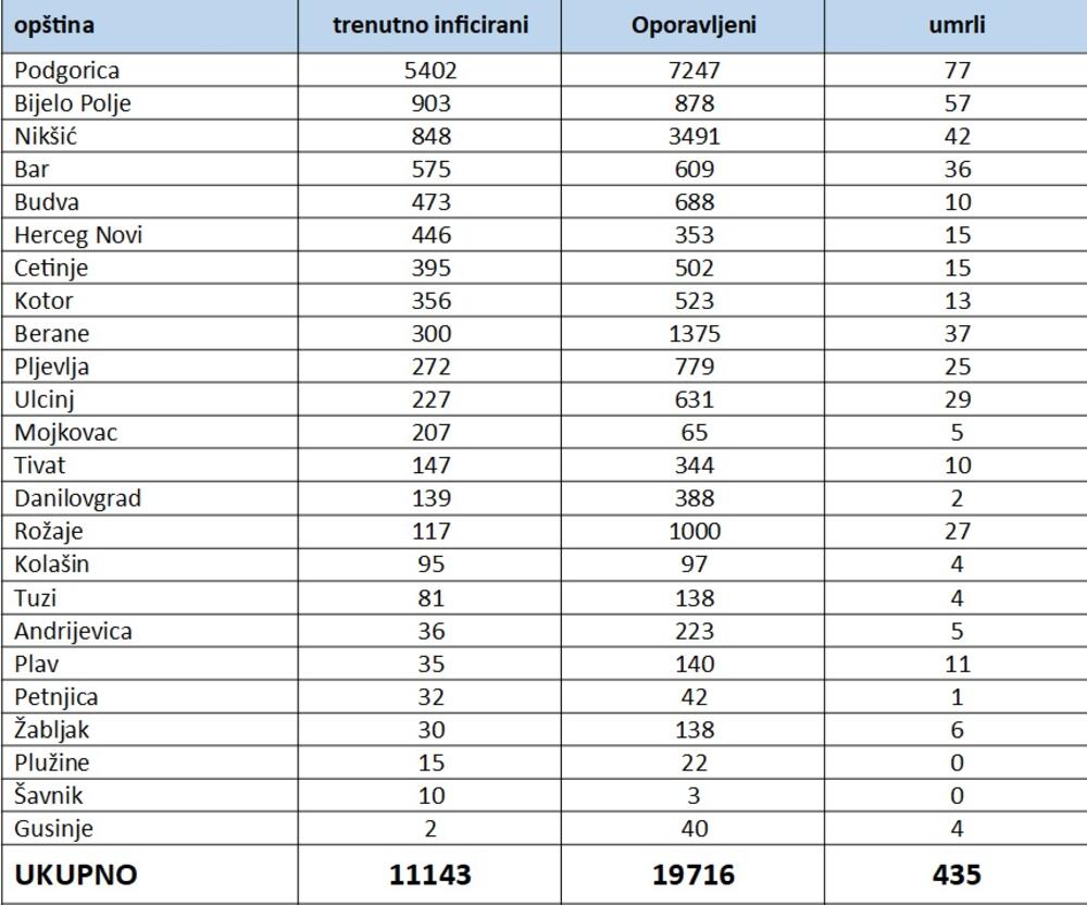 “Do 17:00 časova prijavljen je oporavak kod 540 pacijenta. Uzimajući u obzir sve novootkrivene slučajeve kao i broj oporavljenih, ukupan broj trenutno aktivnih slučajeva COVID19 u Crnoj Gori iznosi 11.143. Od početka godine ukupan broj registrovanih slučajeva infekcije novim korona virusom je 31.618”, poručili su iz IJZ.