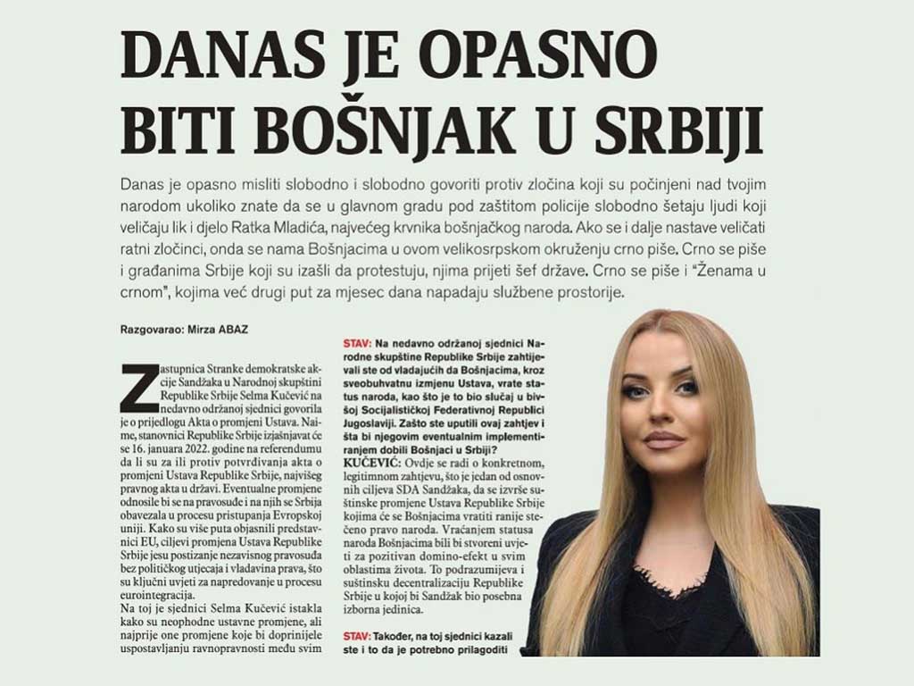 Zastupnica Stranke demokratske akcije Sandžaka u Narodnoj skupštini Republike Srbije Selma Kučević na nedavno održanoj sjednici govorila je o prijedlogu Akta o promjeni Ustava. Naime, stanovnici Republike Srbije će se 16. januara 2022. godine izjašnjavati na referendumu da li su za ili protiv potvrđivanja akta o promjeni Ustava Republike Srbije, najvišeg pravnog akta u državi. Eventualne promjene bi se odnosile na pravosuđe i na njih se Srbija obavezala u procesu pristupanja Evropskoj uniji. Kako su više puta objasnili predstavnici EU, cilj promjena Ustava Republike Srbije su postizanje nezavisnog pravosuđa bez političkog utjecaja i vladavina prava, što su ključni uvjeti za napredovanje u procesu eurointegracija.