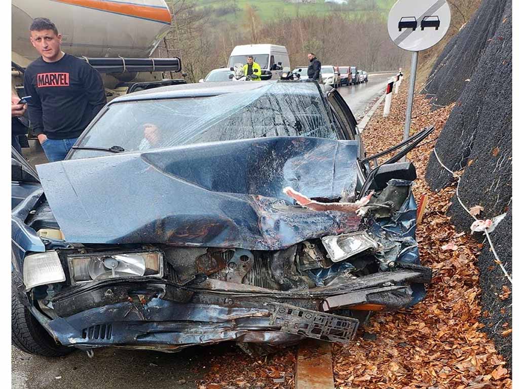 U udesu je povređen vozač putničkog automobila, koji je udario u u cisternu leskovačkih registracionih oznaka.
