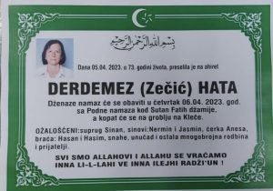 Hata Derdemez preselila je u 73. godini života. Dženaze namaz će se obaviti danas sa podne namaza. Za svojom učiteljicom i sugrađankom danas žale svi oni koji su imali privilegiju da im ona bude učiteljica, kao i svi koji su je poznavali. Po oceni kolega imala je neverovatan pedagoški pristup, majčinski se odnosila prema svojim učenicima. Uz takvu posvećenost i brižnost izvaličila je iz đaka najbolje, a da nikada nije povisila ton ni na koga. To je bilo vrijeme kad su djeca voljela da idu u školu, zato što ih je tamo čekala učiteljica Hata. Na društvenim mrežama sugrađani i njeni đaci se sa najlepšim riječima hvale opraštaju od voljene učiteljice